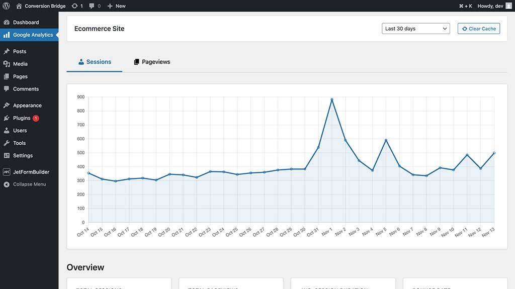 In fact, Conversion Bridge makes it easy to embed the analytics dashboards for many of the supported platforms directly into the WordPress admin including Google Analytics 4! This gives the appearance of a fully branded, native analytics tool without any custom development. Clients stay in the dashboard they know, and you look like a genius.